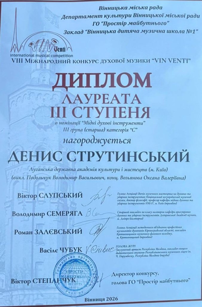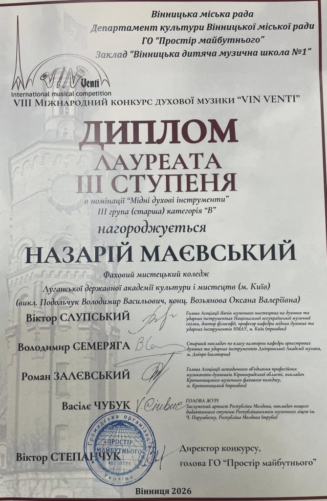 Здобувачі освіти Академії й Фахового мистецького коледжу стали лауреатами VIII Міжнародного конкурсу духової музики «VIN VENTI»